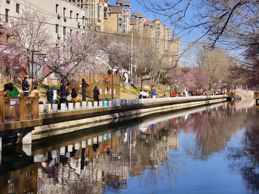 近日,朝阳区十里堡二道沟旁的山桃花竞相绽放,绵延百米的“粉色花廊”徐徐铺展、倒映水中,不少市民游客前来赏花打卡。